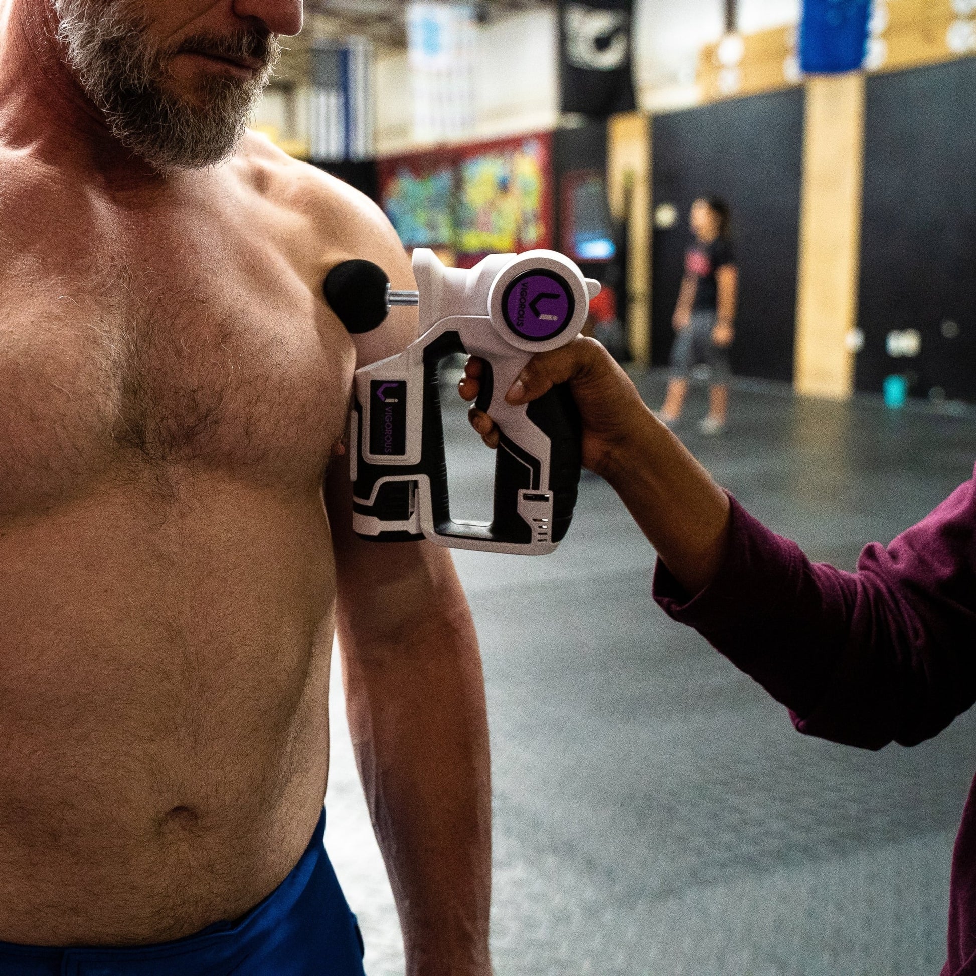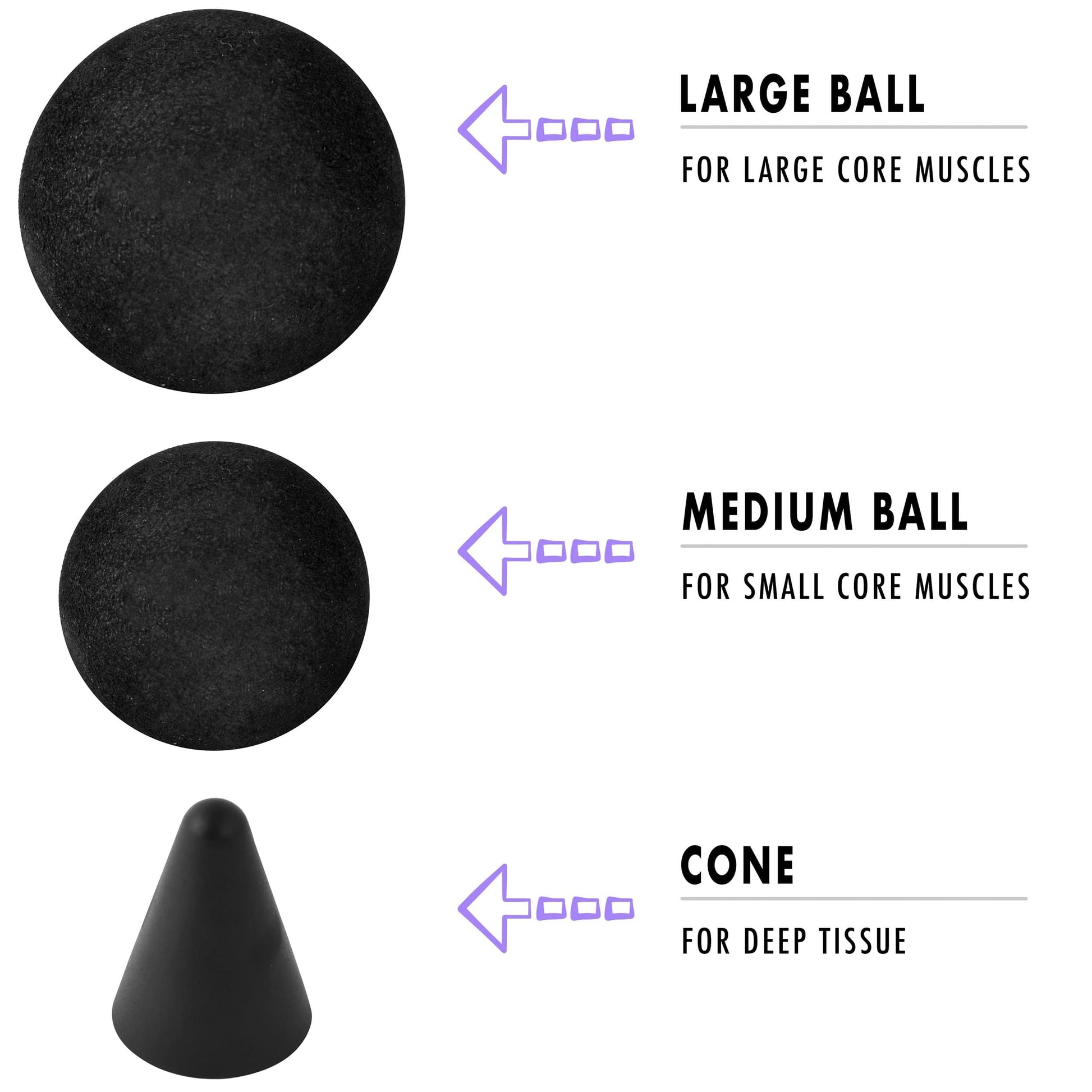 We include 3 percussive massage heads. A large ball for large muscles, a smaller ball for specific knots, and a cone shaped keep tissue massaging point.